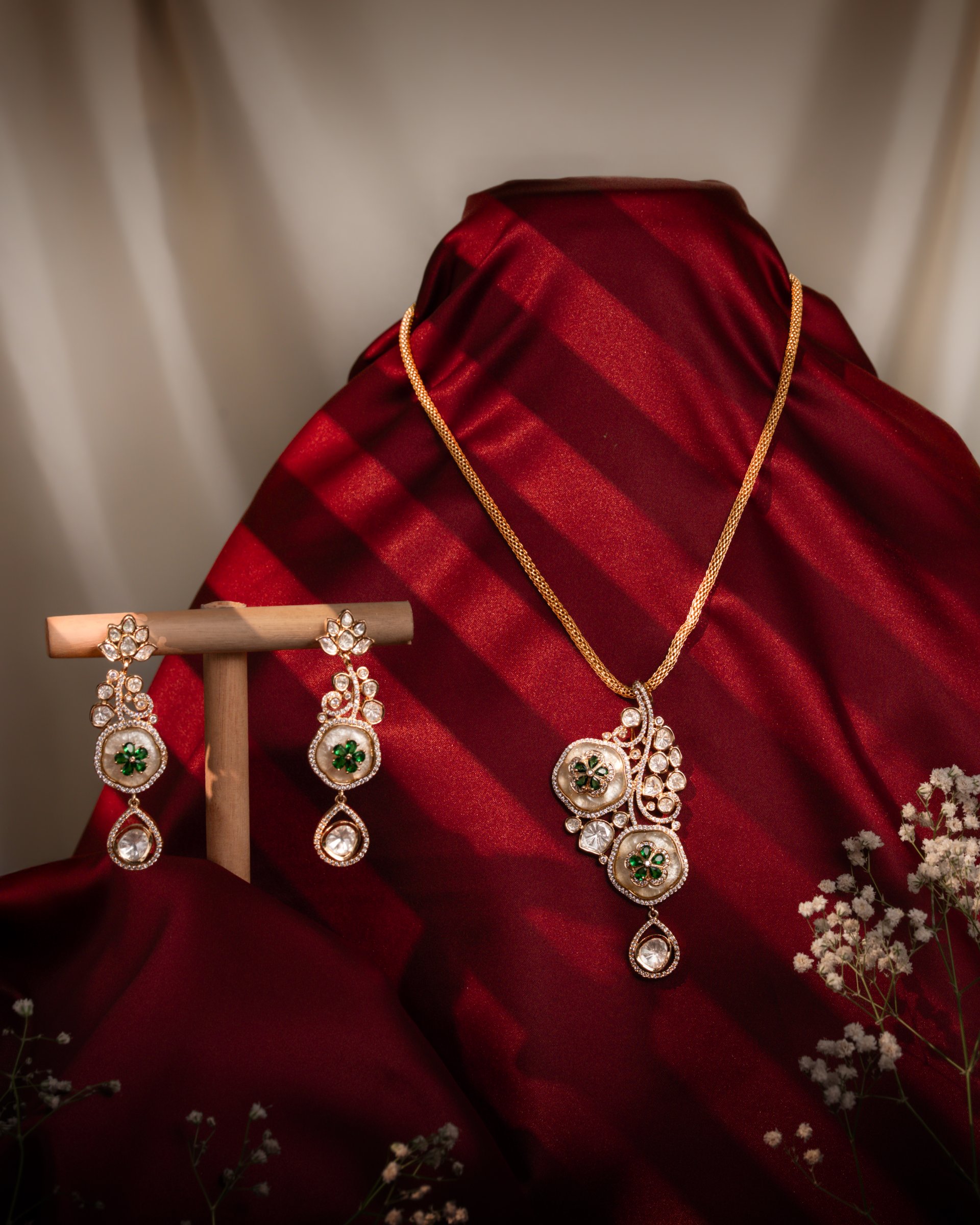 The Emerald Whisper Pearl Pendant Set, a graceful Mother Pearl design in soothing green crafted to bring sophistication and natural elegance to your everyday and festive looks.