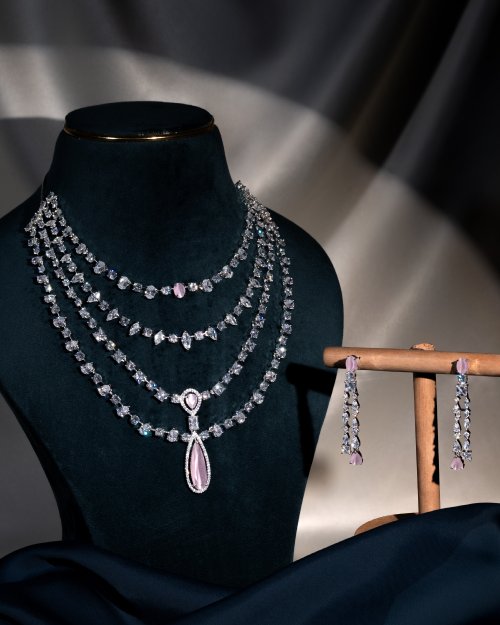 A graceful four-layer AD necklace set with a charming pendant, blending white and baby pink stones for a soft, feminine, and royal touch.