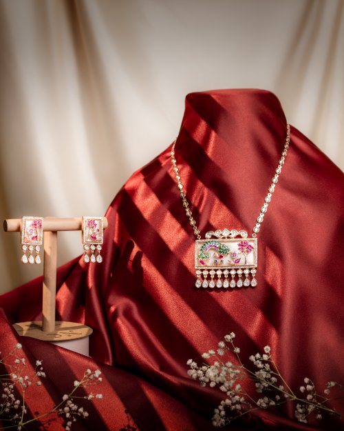 - Design: Simple chain necklace with mother pearl detailing, accompanied by matching earrings