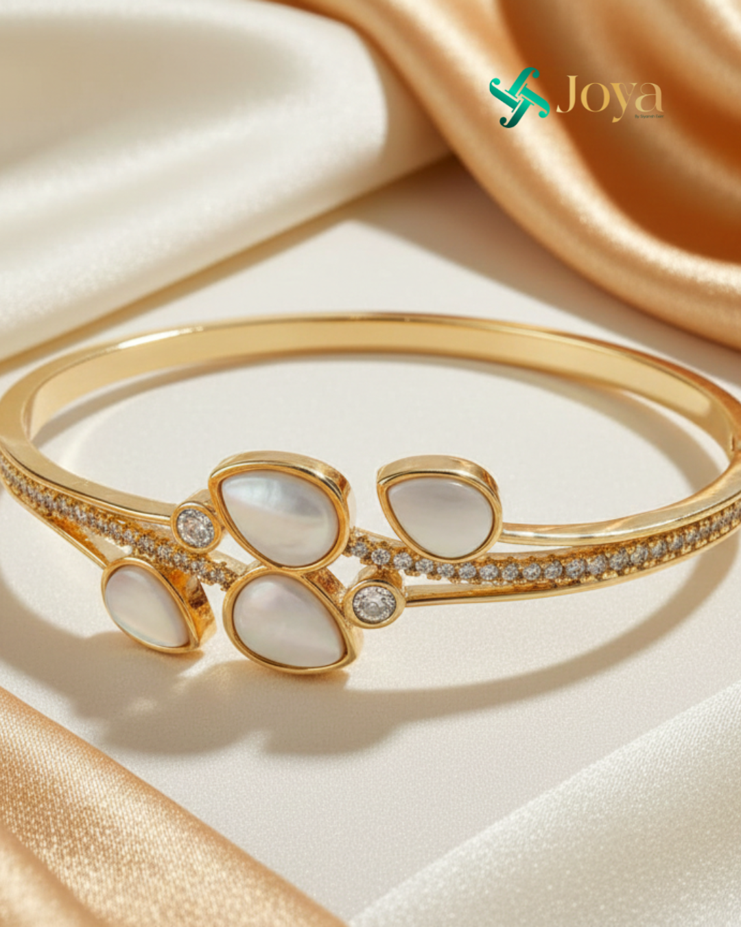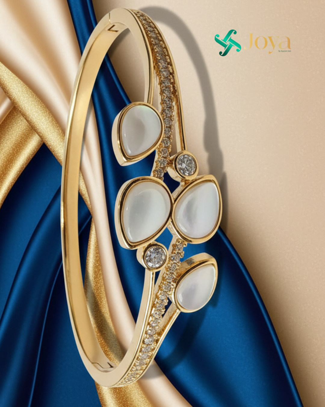 The Joya Pearl Bloom Anti-Tarnish Gold Bracelet by Joya by Siyansh Exim is a refined demi-fine jewellery piece designed for effortless elegance. Featuring a polished gold finish accented with delicate pearl-inspired stones, this bracelet offers timeless beauty with a contemporary touch. Its lightweight feel and anti-tarnish coating ensure lasting brilliance, making it an ideal accessory for both special occasions and elevated everyday styling.