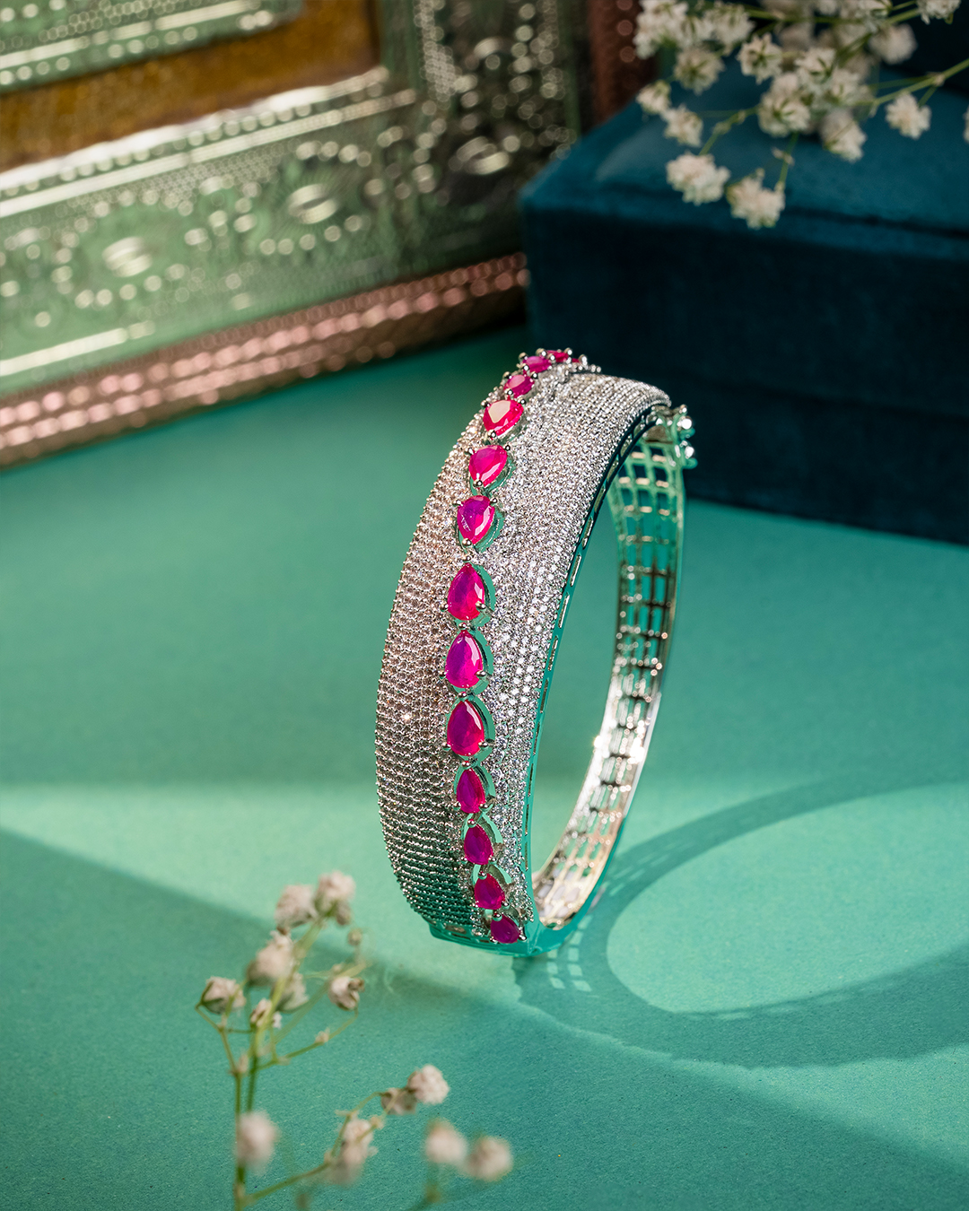 - Design: Broad cuff-style bangle fully paved with sparkling Moissanite stones, accented by a continuous row of pear-shaped red stones; features a sophisticated basket-weave side design