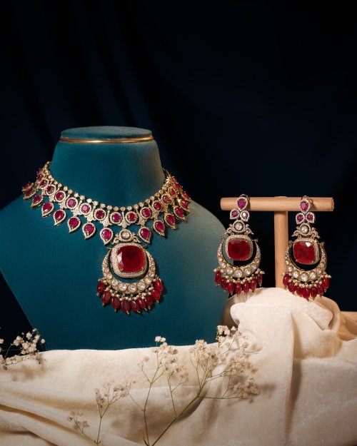 The RubyVelour Kundan Polki Set embodies a delicate fusion of ruby radiance and timeless royal craftsmanship, adorned with sparkling Polki stones, intricate detailing, and rich ruby accents to celebrate feminine elegance with a regal touch, while its lightweight yet luxurious design complements bridal, festive, and traditional ensembles, adding warmth, grace, and queen-like charm to every look.