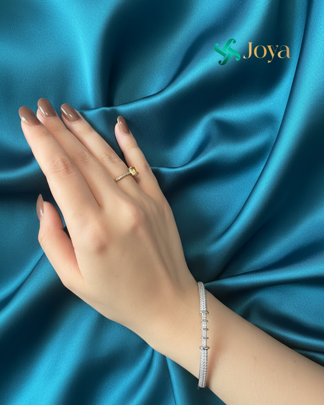 Segmented tennis-style bracelet) features a sleek, structured design that blends contemporary geometry with timeless brilliance. It is crafted to be a versatile statement piece, perfect for stacking or wearing as a solo focal point.