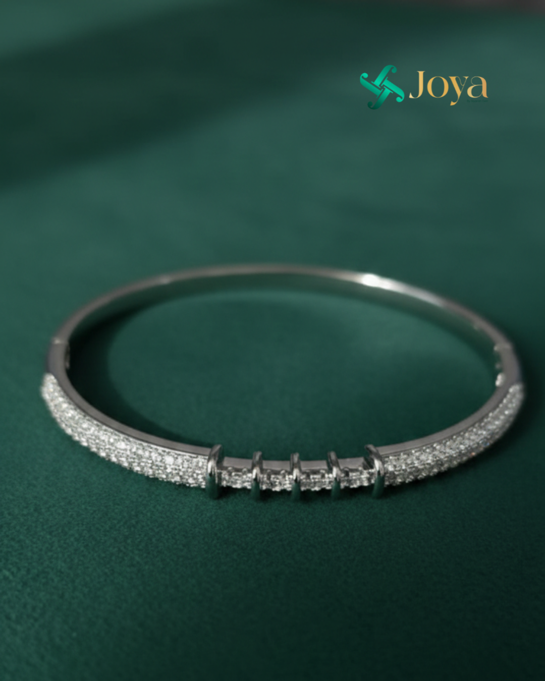• Design: Sleek modern tennis bracelet with refined linear structure, uniformly pave-set clear stones, and subtle vertical accent bars; elegant sparkle with a clean, contemporary aesthetic