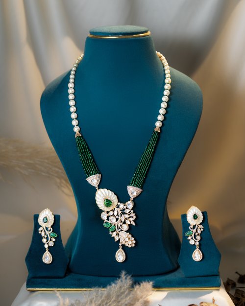 A beautifully crafted Verdelle Pearl Mala Set, enhanced with green accents, designed to add timeless elegance and serene charm to your special occasions.